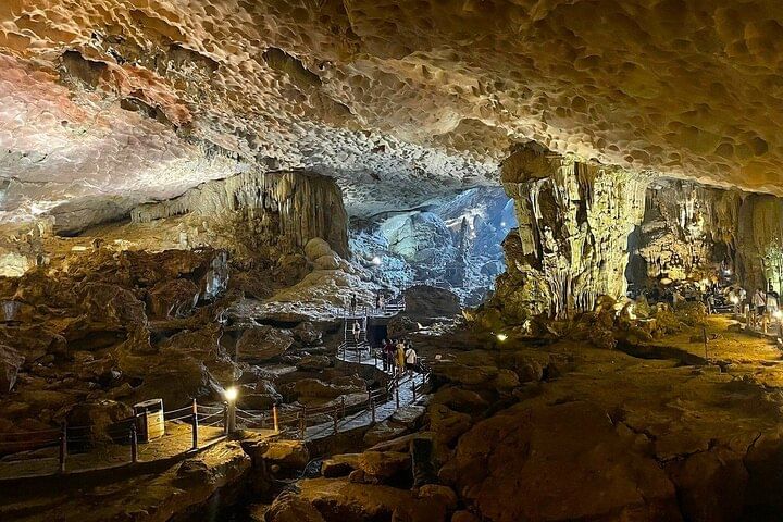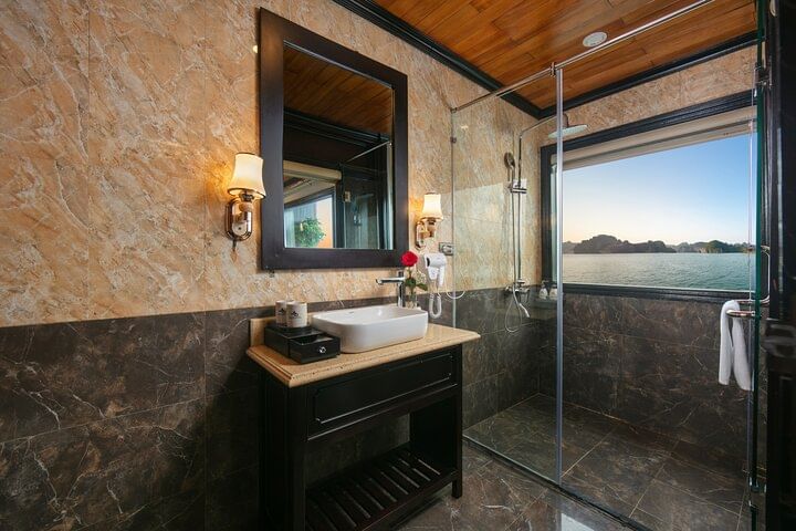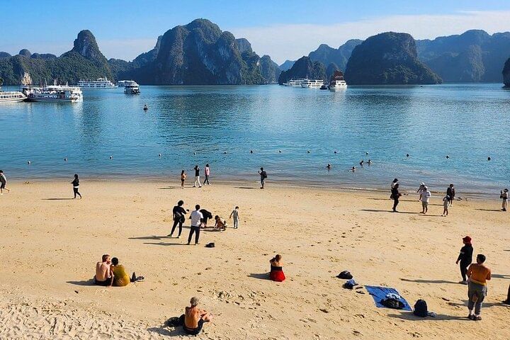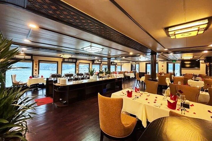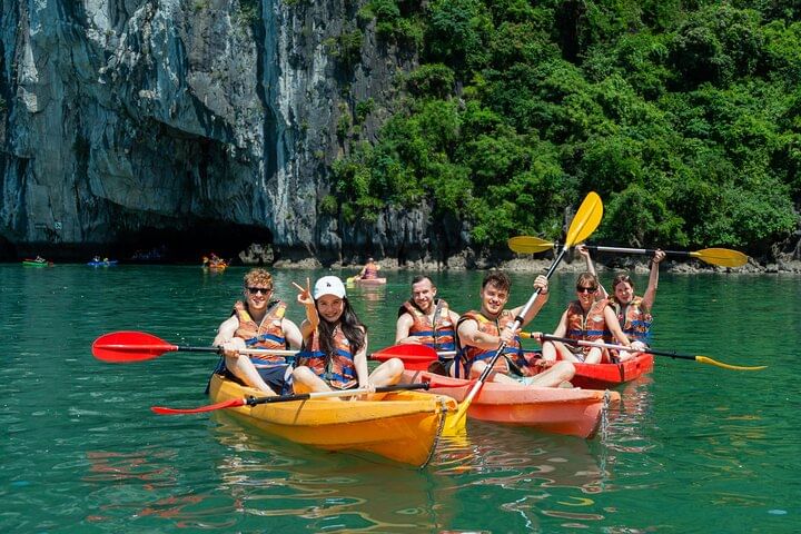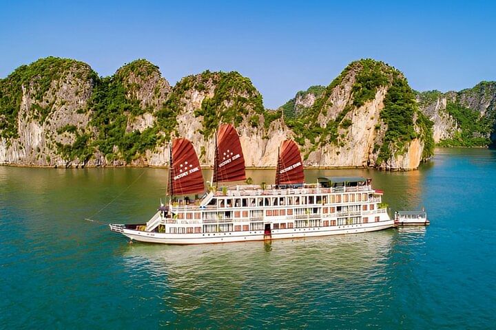 Indulge in the breathtaking beauty of Ha Long Bay with a unique cruise aboard a boat fit for royalty. Enjoy complimentary gourmet meals and thrilling adventure activities, including kayaking near stunning limestone karst formations, hiking or swimming on Titop Island, and exploring the mesmerizing Sung Sot Cave. Revel in the elegance of a boutique boat as you glide through the emerald waters of Ha Long Bay. In the evening, embark on a night squid fishing adventure or unwind with a lively karaoke session, making your experience truly unforgettable.